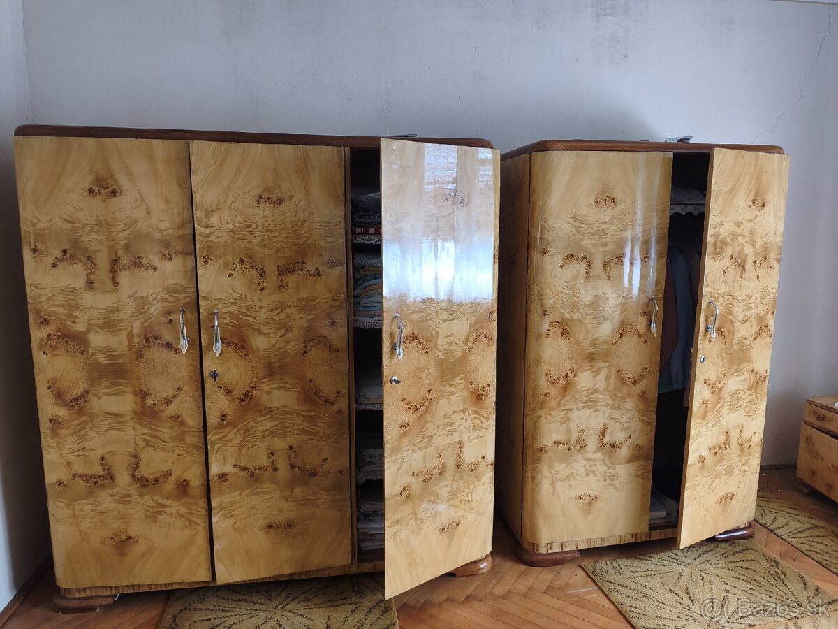 Spálňa art Deco - [24.3. 2026]Predám kompletnú, veľmi zachovalú spálňu v štýle art Deco (30. až 60. roky). Dve skrine ( dvoj a trojdielna), zrkadlová stena, manželská posteľ šírka 155cm bez matracov a roštov, dva nočné stolíky.