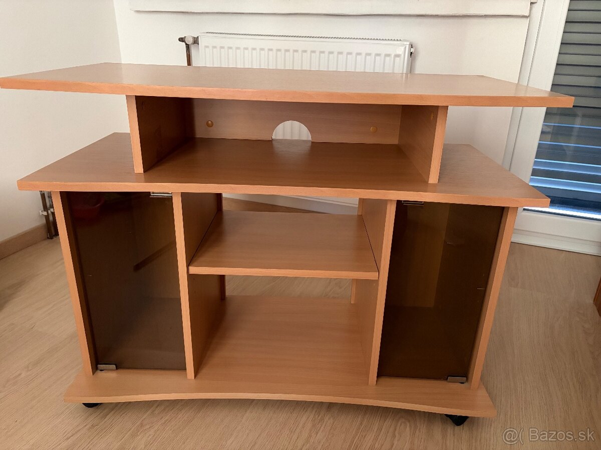 TV stolík na kolieskach v dekore dreva s dymovými sklenenými dvierkami. Tento typ nábytku je navrhnutý pre uloženie televízora a audio/video techniky, pričom obsahuje praktické otvory na vedenie káblov. Osobny odber trebatice - okolie