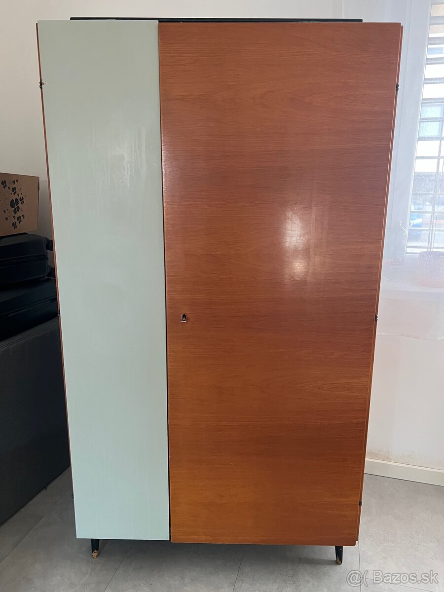 Retro skriňa - [9.2. 2026]Predám retro skriňu z 60.–70. rokov, československá výroba. Pekný jednoduchý dizajn v mid-century štýle, nožičky, pôvodné kovanie. Vnútro má časť na vešanie aj police. Pôvodný zachovalý stav, bežné známky používania (viď foto). Stabilná a plne funkčná.