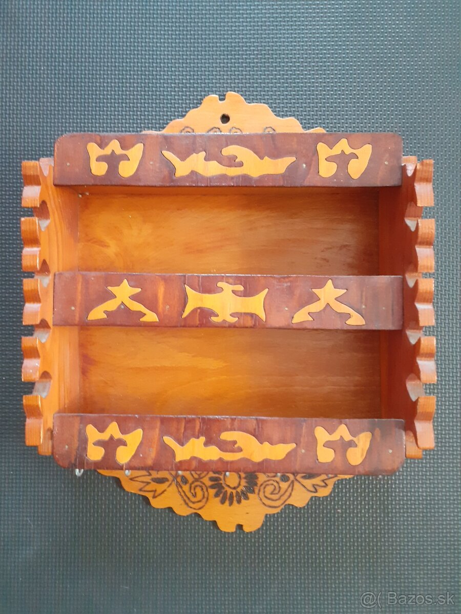 Predám dve staré ľudové / folklórne drevené police / poličky vhodné do kuchyne na koreničky alebo malé šálky / hrnčeky. Na chalupu / chatu či na renováciu a oživenie do nového priestoru. Pochádzajú z obce Stará Huta, okres Detva, región Podpoľanie, oblasť Javorie. Obe sú v pôvodnom stave. Na prvej sú zo spodu prakticky namontované háčiky so závitom na zavesenie kľúčov alebo malého náradia či pomôcok. Môžete si ich ľahko odstrániť, pokiaľ sa vám nebudú hodiť. Prvá polička je vo výbornom stave, lakovaná, zdobená vypaľovaným ornamentom, vyrezávaním a intarzovaná drevom. Druhá polička je určená na renováciu, zdobená je vypaľovaným ornamentom a vyrezávaním, lak je ošúchaný a spodná doska je stočená a prasknutá.