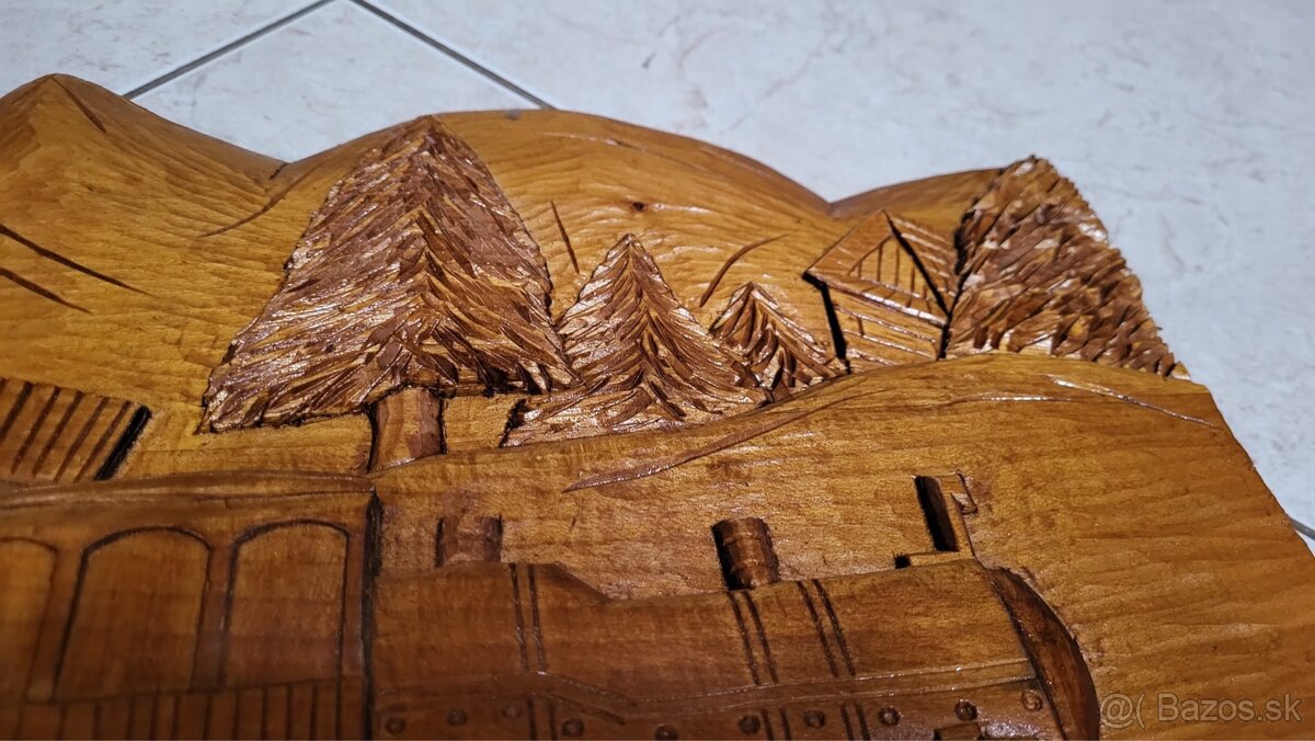 Drevorezba s vysokým reliéfom,ktorá zachytáva detaily lokomotívy stromov,malej chaty.Rozmery 39x29cm.Cena 45eur.Iba osobny odber! V pripade zaujmu volajte 0905365945