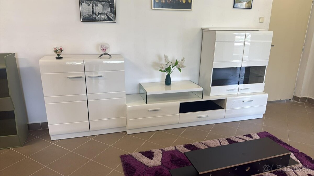 Predám krásnu modernú obývaciu zostavu v bielom lesku. Obsahuje viacero skriniek, vitrínu a TV stolík – ideálne riešenie do modernej obývačky.