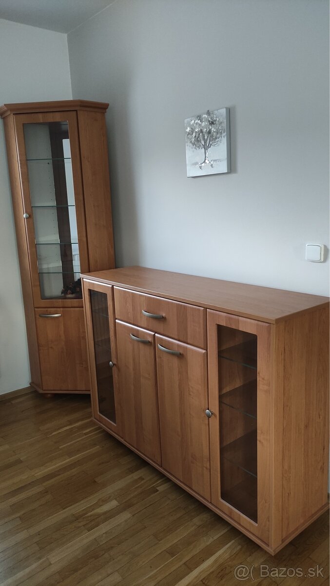 Ponúkam na predaj rohovú skriňu so sklenenou výplňou, sklenenými policami plus komodu.