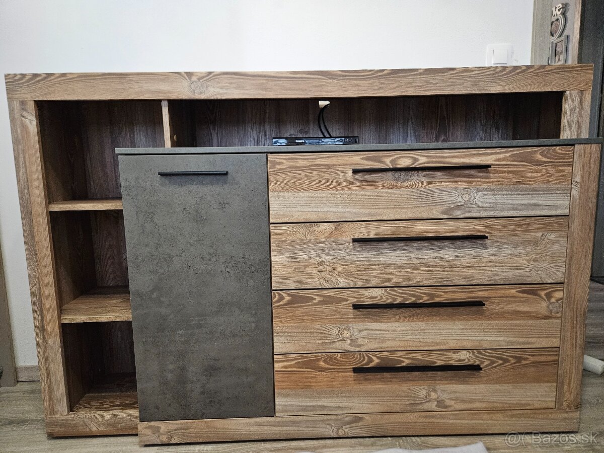 Kupena v Mobelix. Dovod predaja je vyroba nabytku na mieru,mensie tuknutia, inak v bezchybnom stave. Upravena na moznost TV na hornej polici a pod telkou su mozne umiestnit prehravace pripadne boxy.