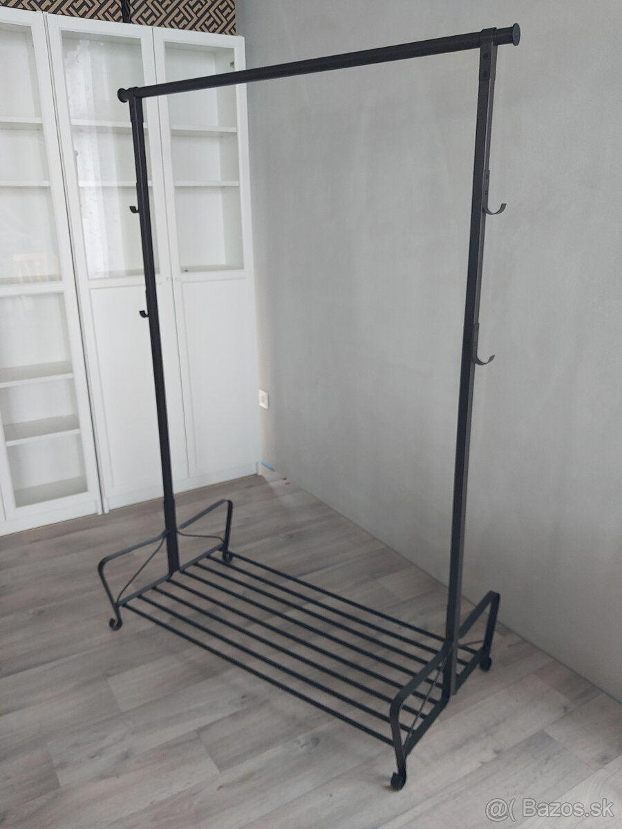 Kovový / kovaný /pevný tmavohnedý vešiak. Dĺžka 110cm, hĺbka 60cm a výška 166cm. Cena 30e