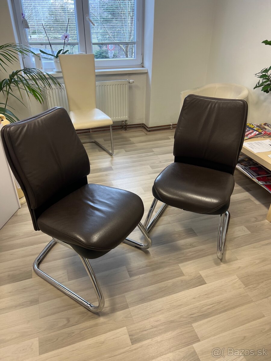 Predám 2 hnedé kožené stoličky veľmi zachovalé malo používané. Rozmery sedenia 50x50cm výška s operadlom 97cm. Vid foto kus 20 euro spolu 40 euro. Kontakt 0940507090