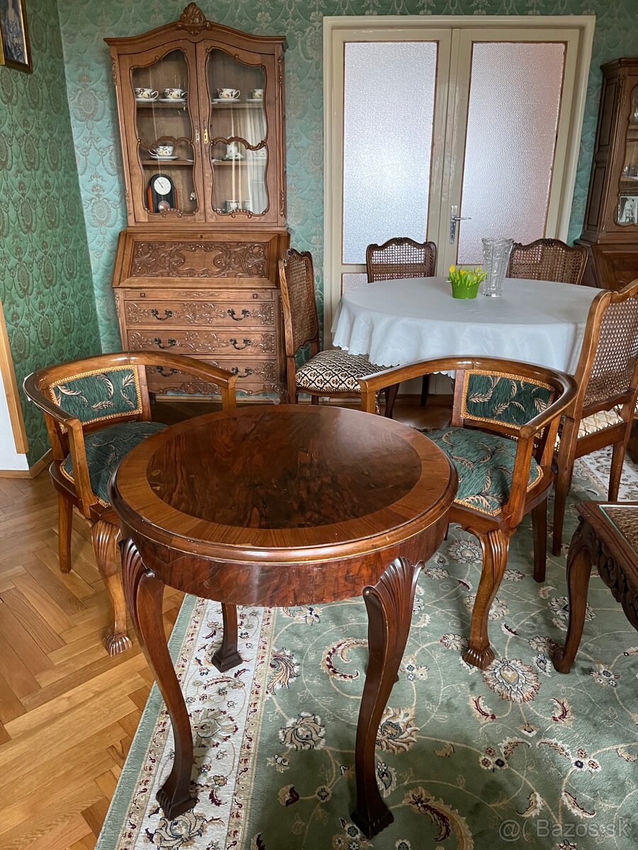 Kresla z konca 19. stor. Kompletne reštaurovane orech masiv šelakova polytura. Stol neskorsieho dáta orechova dyha.