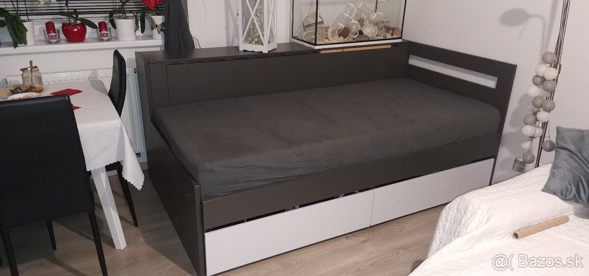 Krásna kvalitná posteľ, ktorá sa dá rozložiť na dvojposteľ. V zadu ako keby v opierke sa odkladá odkladať druhý matrac. Na opierku sa dajú odkladať veci. Má 2 úložné šuplíky. Rozmery v poslednej fotke. Krásna antracitová farba s bielou.