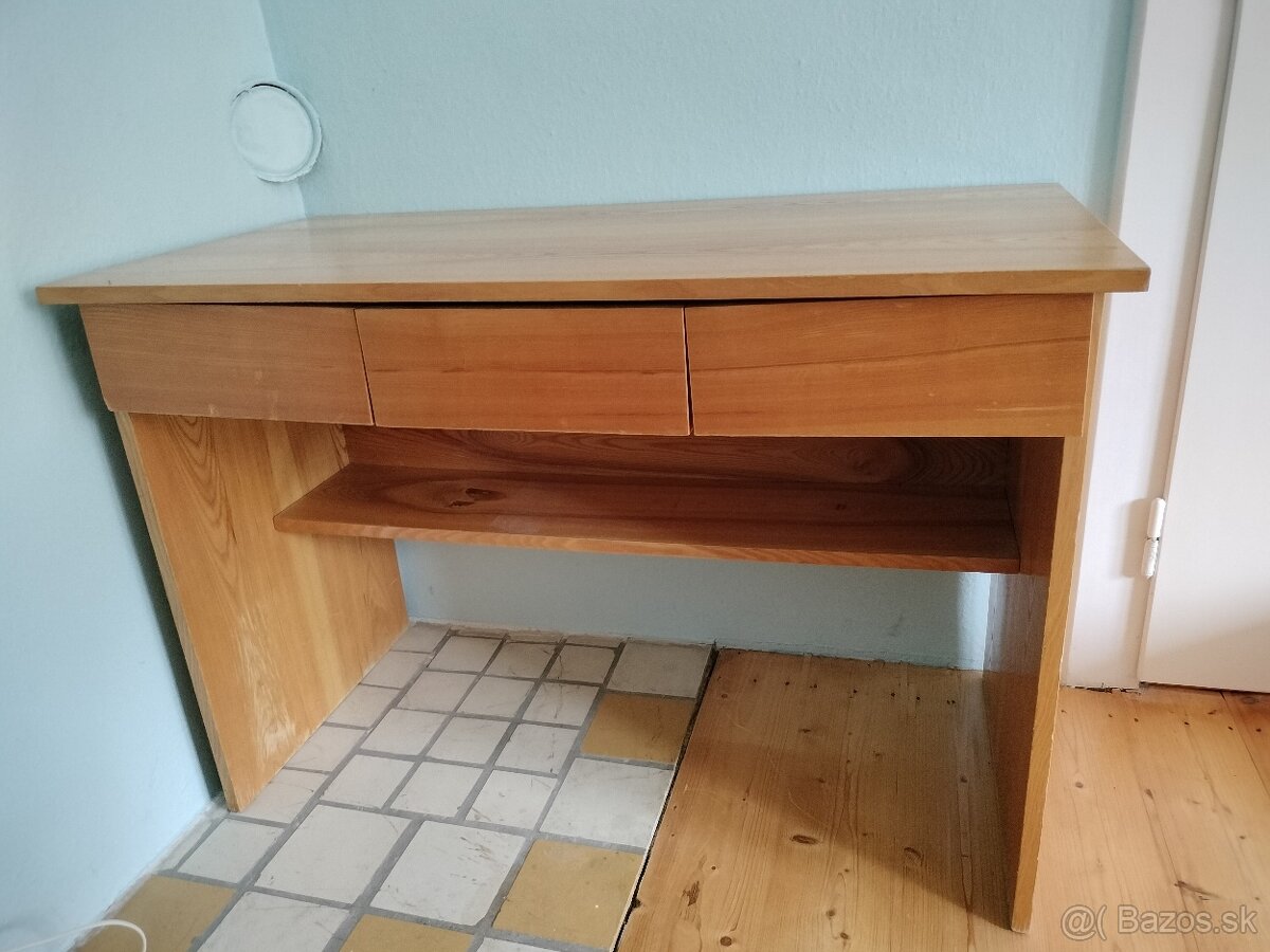 Drevený stolík s 3 šuplikmi a 1 poličkou.