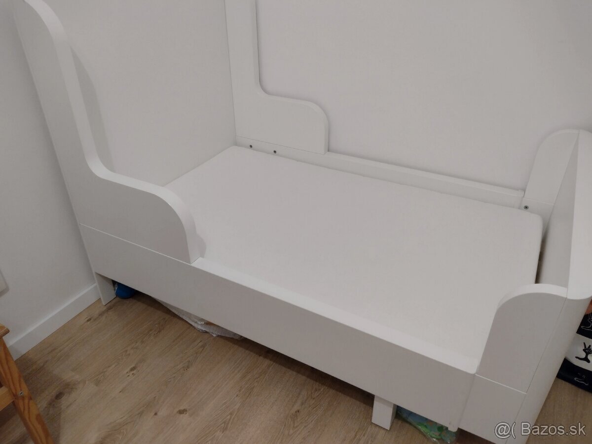 Rastúca detská posteľ IKEA BUSUNGE biela - [3.2. 2026]Predám posteľ v stave ako na foto.Posteľ bola používaná na občasné prespanie tak 3x do týždňa.Je v zloženom stave,momentálne slúži v detskej na odkladanie veľkých plyšákov a oblečenia.Má malý škrabanec na pravom boku-aj na foto.