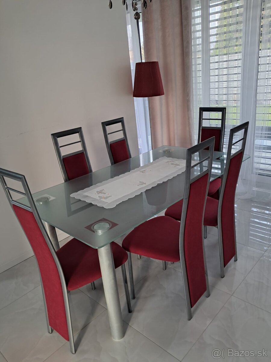 Predám sklenený jedálenský stôl (strieborné nohy) so 6 stoličkami (strieborno-bordové)