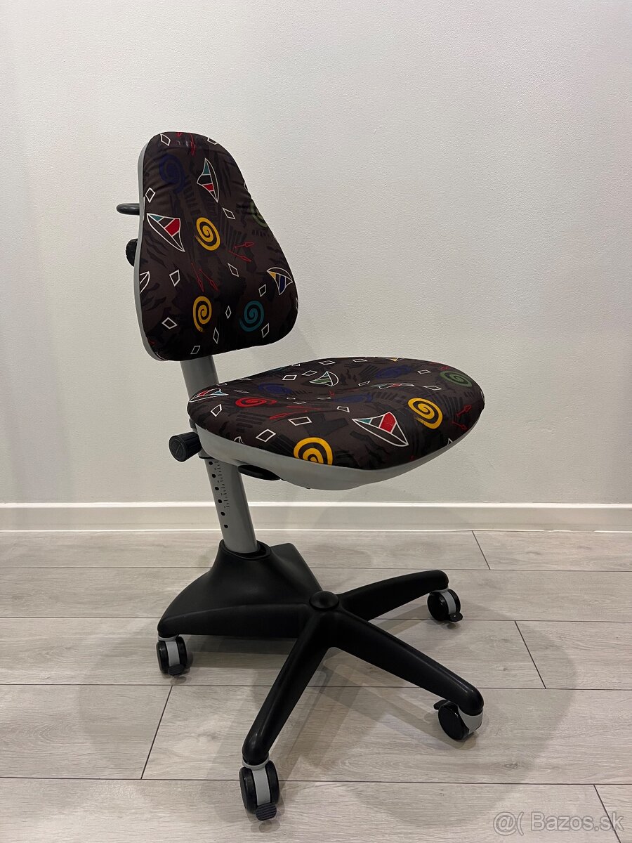 Ergonomicky tvarovaná stolička, ktorá rastie spolu s dieťaťom. Vhodná pre deti od predškolského veku. Sedák aj operadlo sú čalúnené tmavou látkou s farebným geometrickým vzorom. Plastová hviezdicová základňa so sivými kolieskami, bez opierok rúk.