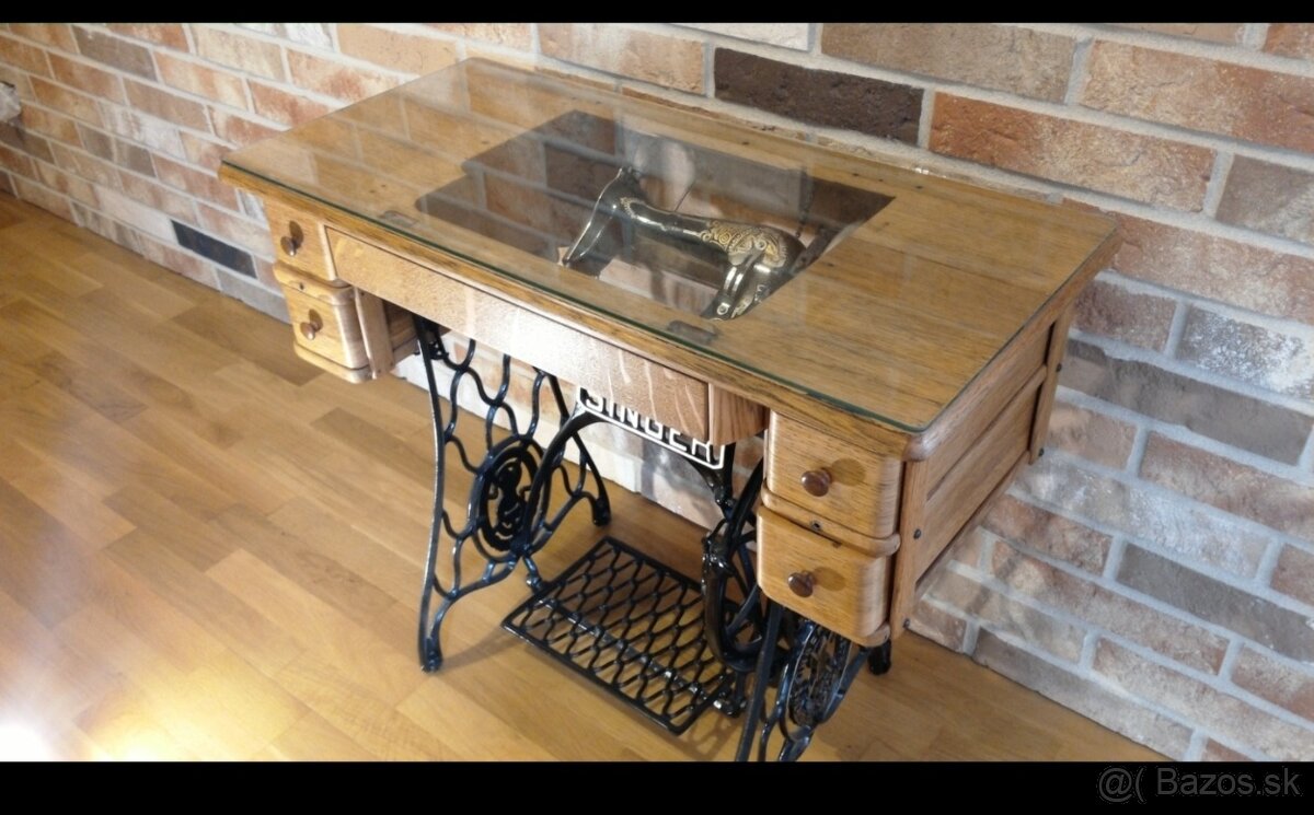 Konstrukcia stroja je opieskovana a na novo striekana , rucne domalovana.Drevo je zrestaurovane, osetrene voskom.Stroj vycisteny,vylesteny, zaveseny v tele stolika.Vrch stolika sklo.Samotne sufliky mozno pouzit na odkladanie drobnych veci.Singer