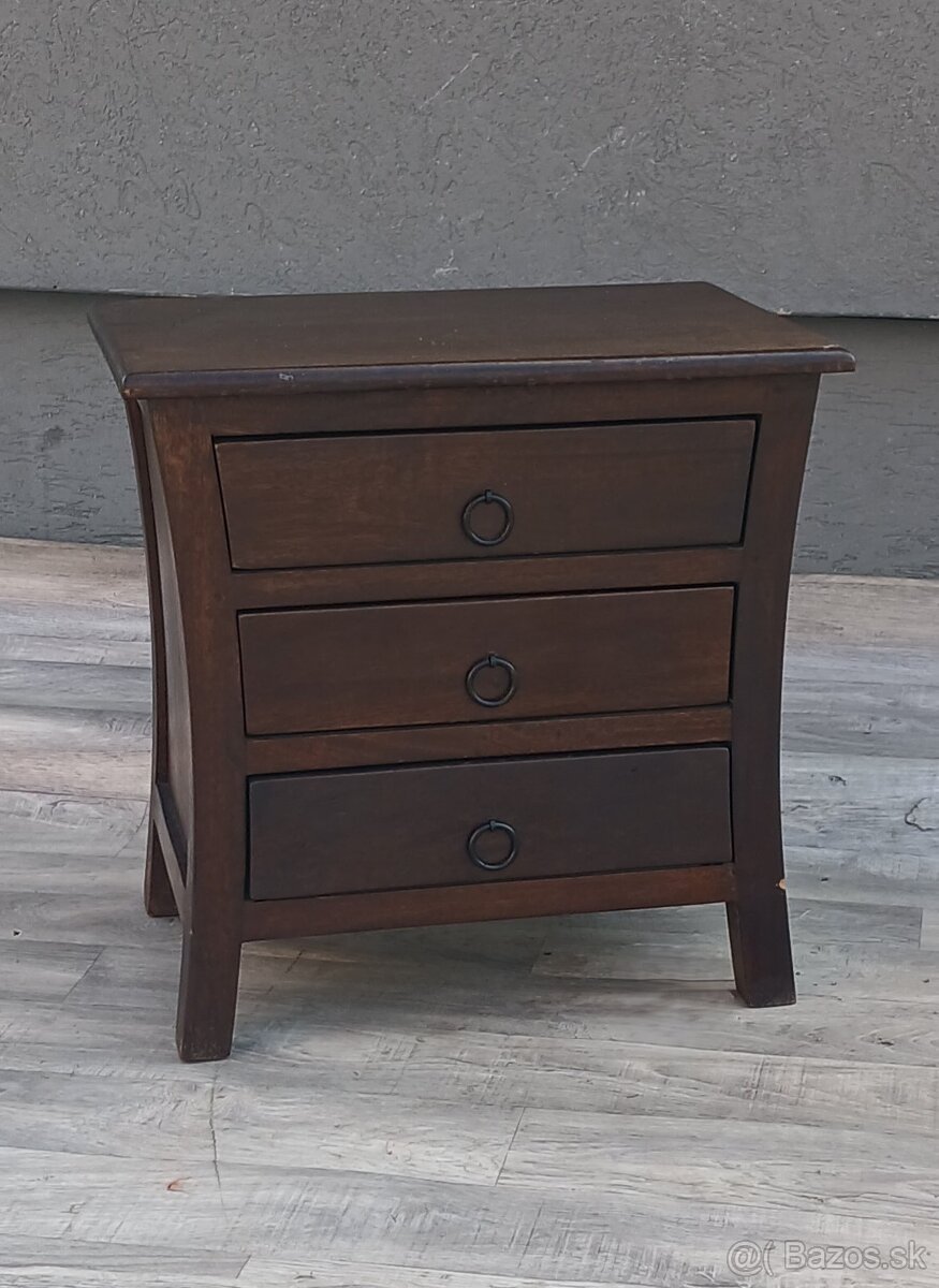 Tento elegantný nočný stolík v koloniálnom štýle bude ideálnym doplnkom pre milovníkov klasického dizajnu a poctivého remeselného spracovania. Je vyrobený z masívneho teakového dreva s tmavohnedou povrchovou úpravou, ktorá zvýrazňuje prirodzenú textúru dreva. Má mierne prehnuté bočné línie, vrchnú dosku s jemným presahom , ktorá poskytuje dostatok miesta pre lampu , alebo knihu . Disponuje troma priestrannými zásuvkami, ktoré sú ideálne na organizáciu osobných vecí. Každá zásuvka je doplnená o decentnú kovovú úchytku v tvare krúžku v tmavom prevedení. Stojí na pevných, hranatých nohách, ktoré zabezpečujú vysokú nosnosť a stabilitu. Vďaka svojej tmavej farbe a nadčasovému tvaru vynikne najmä v spálňach ladených do rustikálneho, vintage alebo klasického štýlu. Používaný . Výška – 51 cm , šírka – 51 cm , hĺbka – 36 cm .Dovoz Holandsko. Dovoz až k Vám domov viem v rámci Slovenska zabezpečiť po dohovore zadarmo . Pozrite všetky moje inzeráty možno zaujme aj niečo iné. Uprednostňujem telefonický kontakt pred sms a emailmi. Všetko je o dohode .