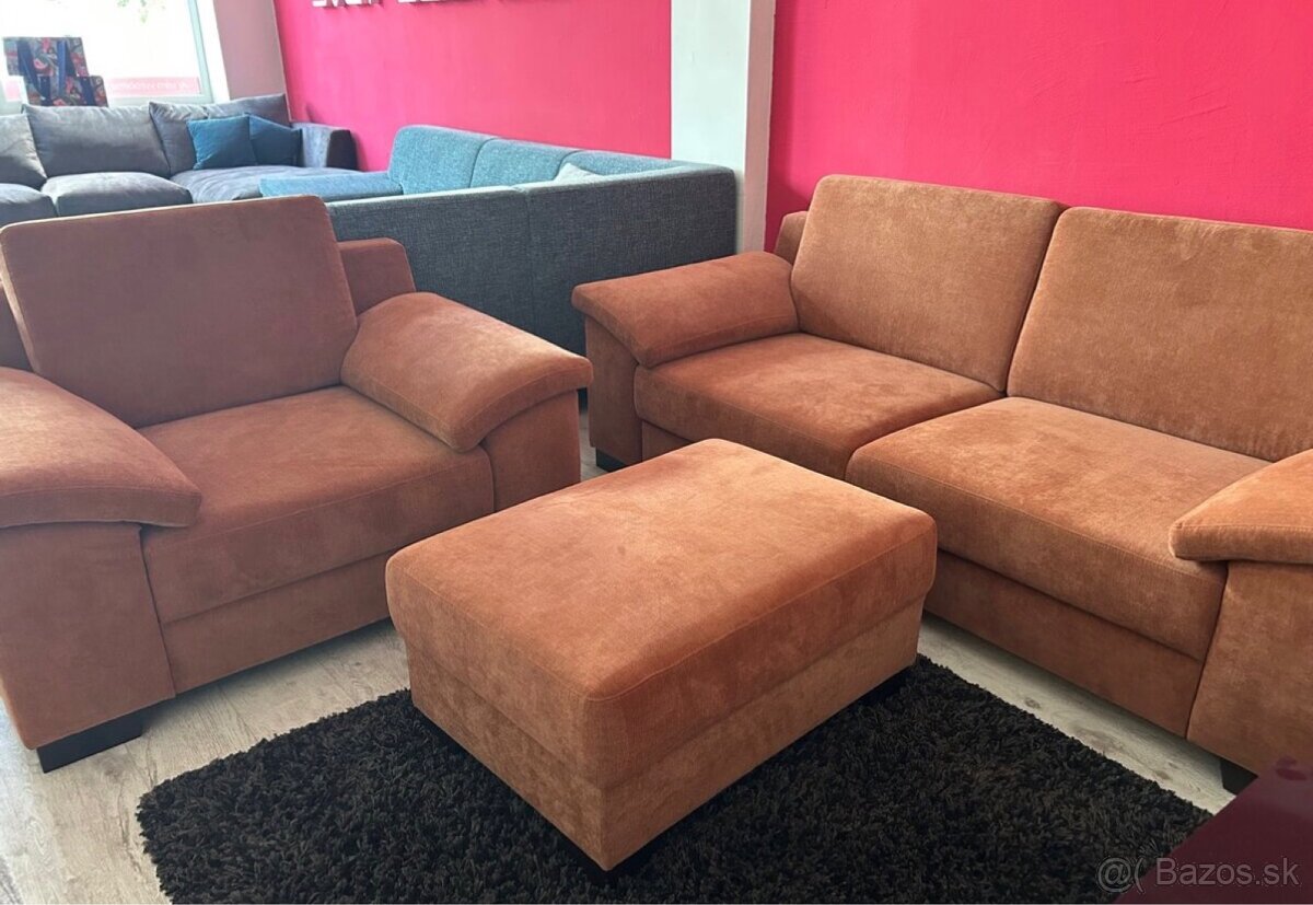 Pozri aj ďalšie sedačky v inzeráte. Predam uplne novu sedaciu supravu vystavenu v expozícii. Rozmer sedacky 215cm, úložný priestor, kreslo 120cm a taburet 85x60 cm. Pôvodná cena 1680€. Odber možný ihneď.