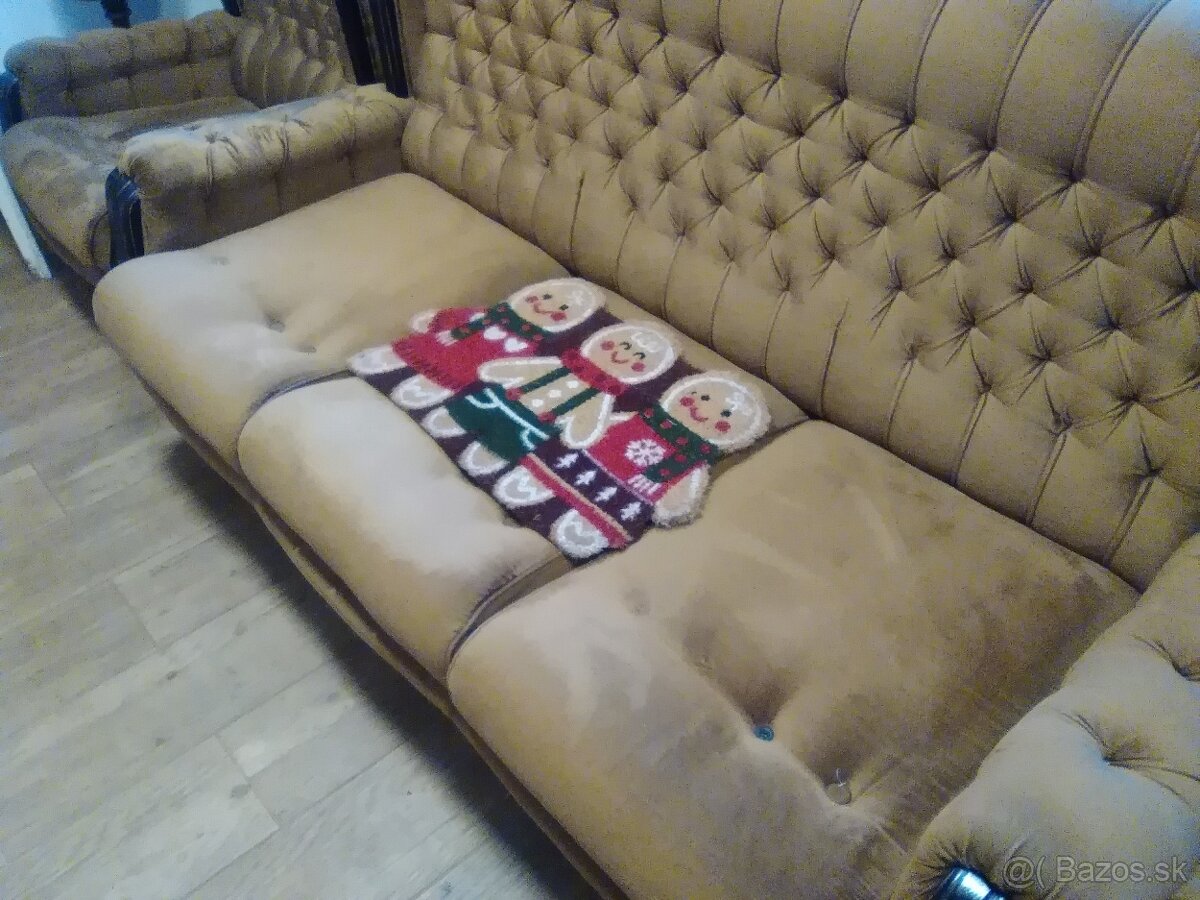 PREDÁM ZACOVALU ROZKLADACIU RETRO SEDACIU SUPRAVU S TROJMIESTNYM GAUCOM A DVOMA KRESLAMI MEDOVEJ FARBY ZNACKY KLARA S DREVENYMI OPIERKAMI.ODBER SEREĎ.Tel.0904 527 291.