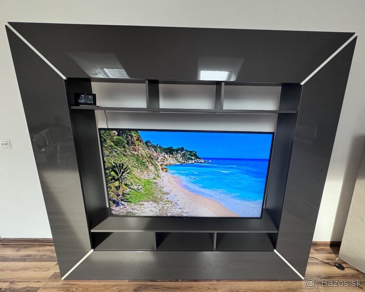 Moderná obývacia stena - [19.4. 2026]Predám štýlovú obývaciu stenu s unikátnym dizajnom, ktorý kombinuje matnú čiernu s luxusným 3D vzorom (Sahara) na predných plochách.