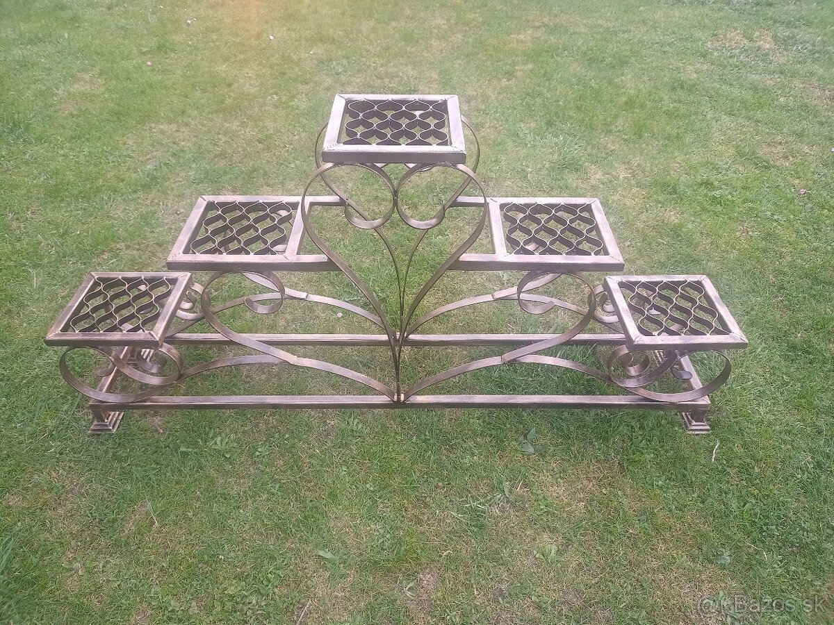 Predäm tento masívny kovový štýlový stojan na kvety vhodný do exteriéru aj interiéru. Stojan má viac úrovní, obsahuje ozdobné prvky a pôsobí dekoratívne