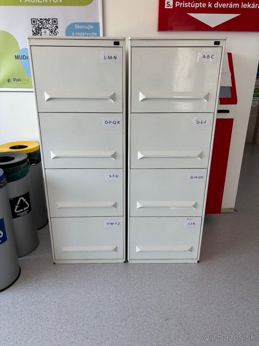 Predám dve 4-zásuvkové kovové kartotečné skrine. Zachovalé, farba neošúchaná. Funkčné, len bez kľúča. Cena za obidve.