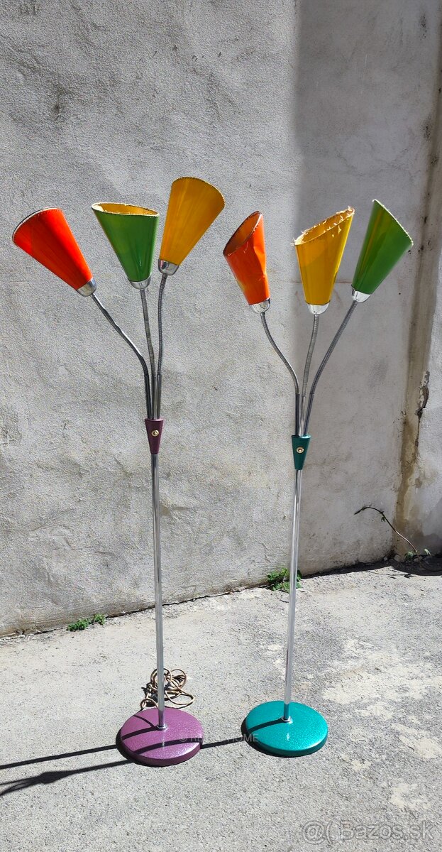 Predám 2 retro stojanové, podlahové lampy Husie krky, typ S 102, výrobca Lidokov, nálezový stav. Lampa s fialovou základňou je funkčná, lampa so zelenou základňou má odstrihnutý kábel, u oboch lámp potrebná výmena kabeláže. Cena 120€ za kus.